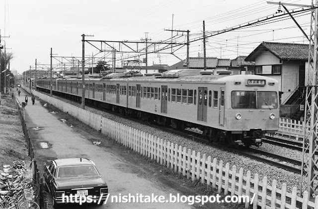 | 西武新宿線の4両+4両による8両編成。 小平-久米川 1984.4.8 |